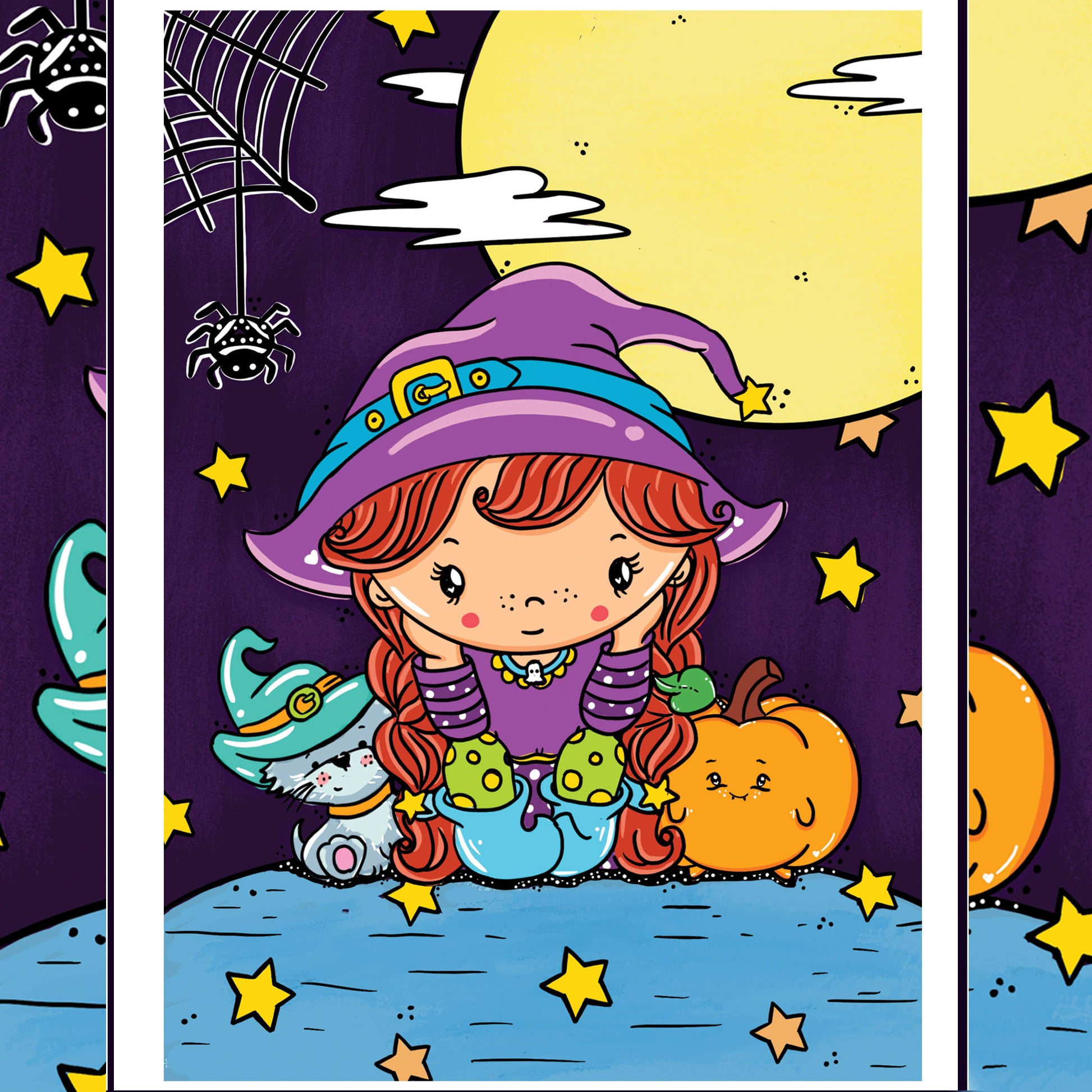 A super sweet A6 postcard print featuring Hattie the Witch and her friends, Kitty and pumpkin.