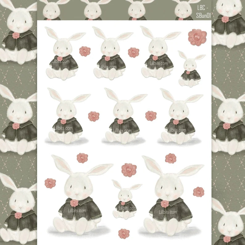 Featuring an adorable lill bunny with grey jacket arranged as a kiss cut sticker sheet - with 2 larger bunnies sitting on a pretty shadow and smaller kiss cut stickers. I have also added a few of the button flowers as kiss cut stickers too.
