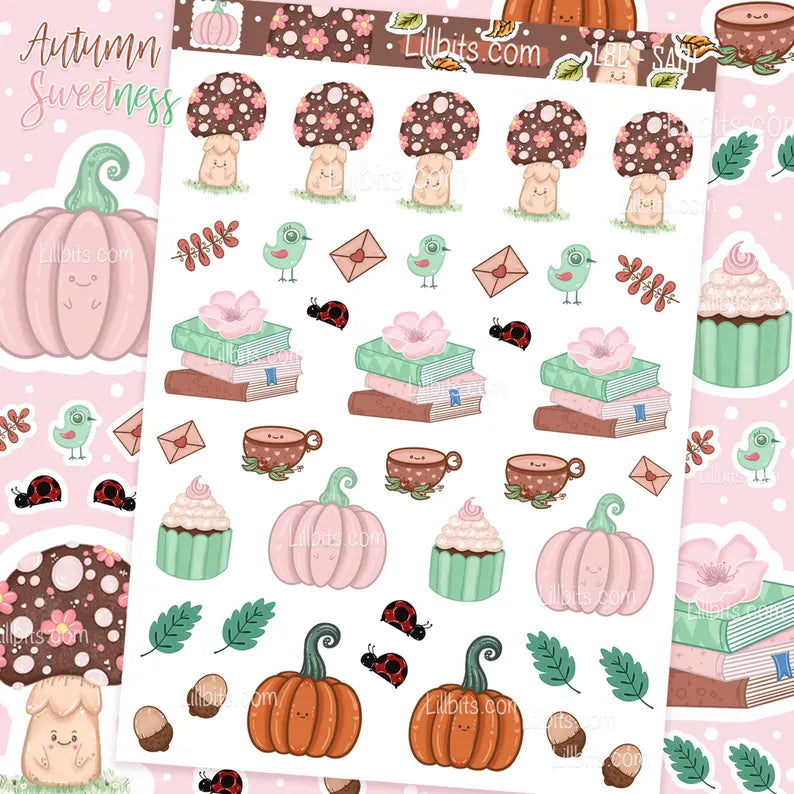 A lovely sweet Autumn and Cozy vibes A6 sticker sheet featuring pretty pumpkin, coffee and cupcake images as well as a set of cozy reading books and extra embellishments.