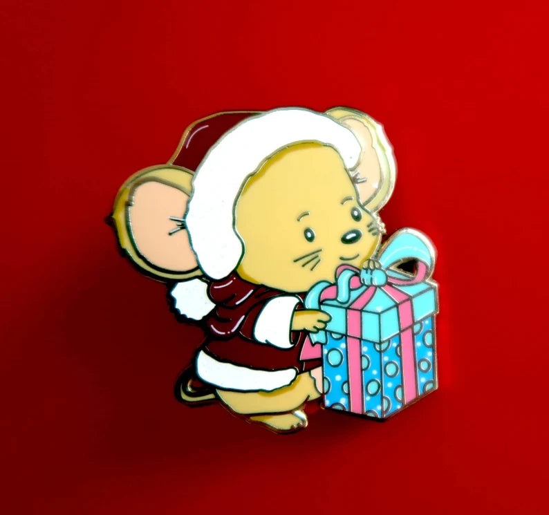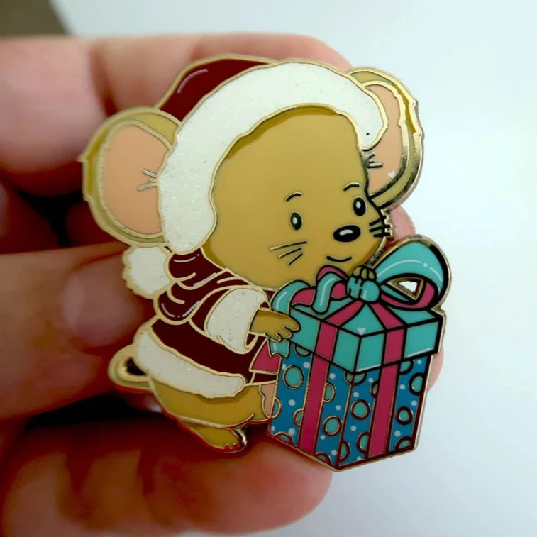 A cute lill 'Chrismouse' hard enamel pin sized at 1.75 inches with gold plating.