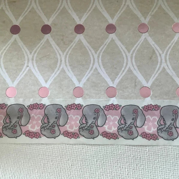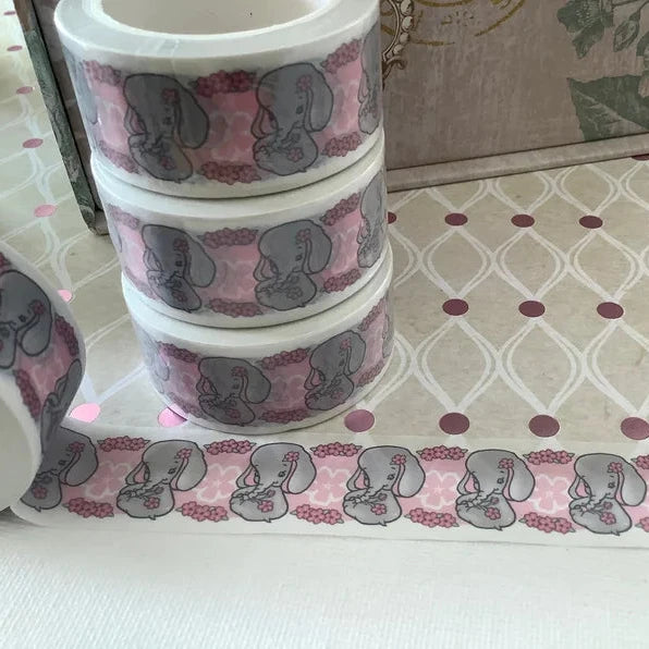 A lovely washi tape featuring Ellie the Elephant on a continuous roll with a sweet floral/white background.