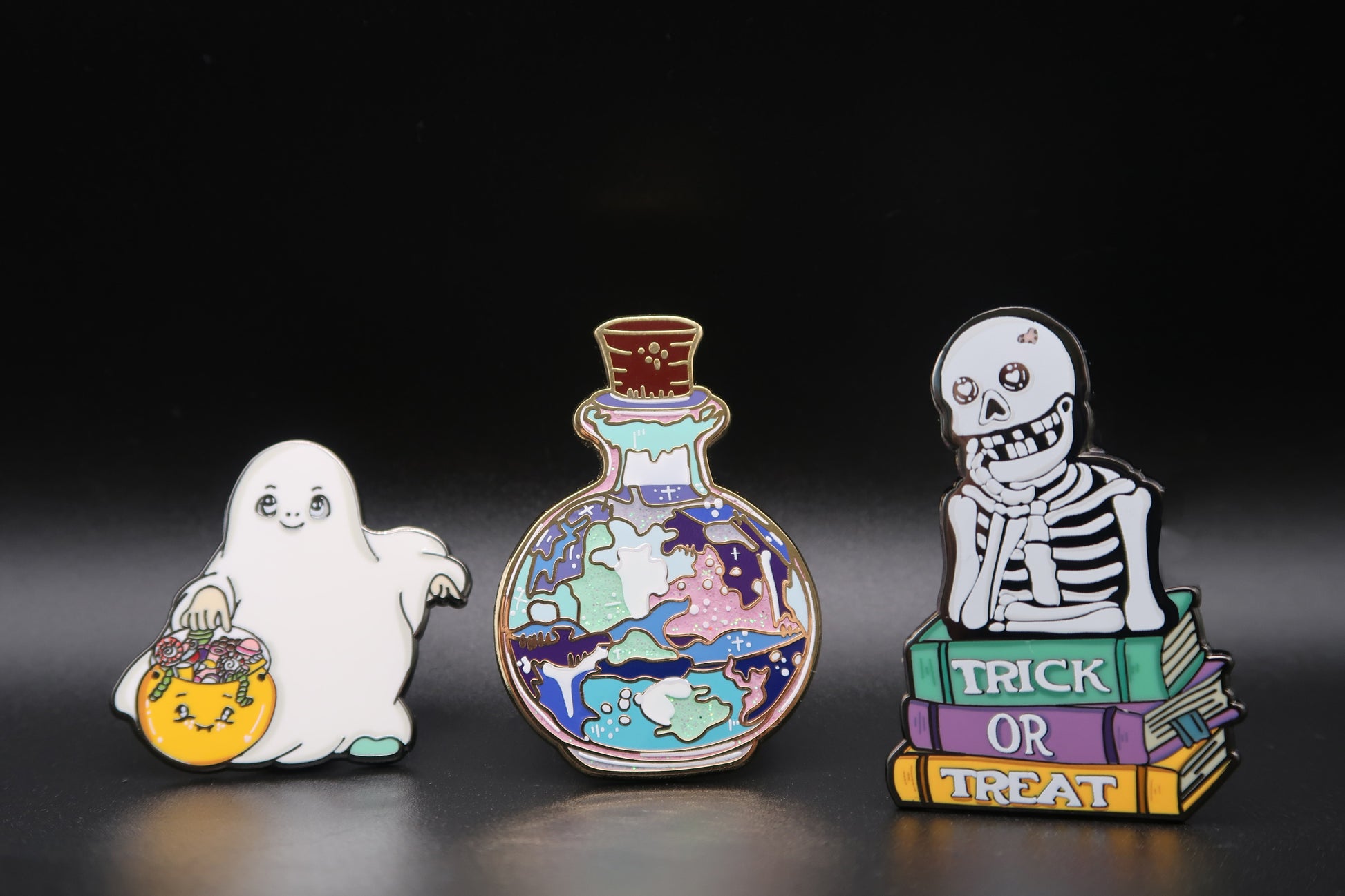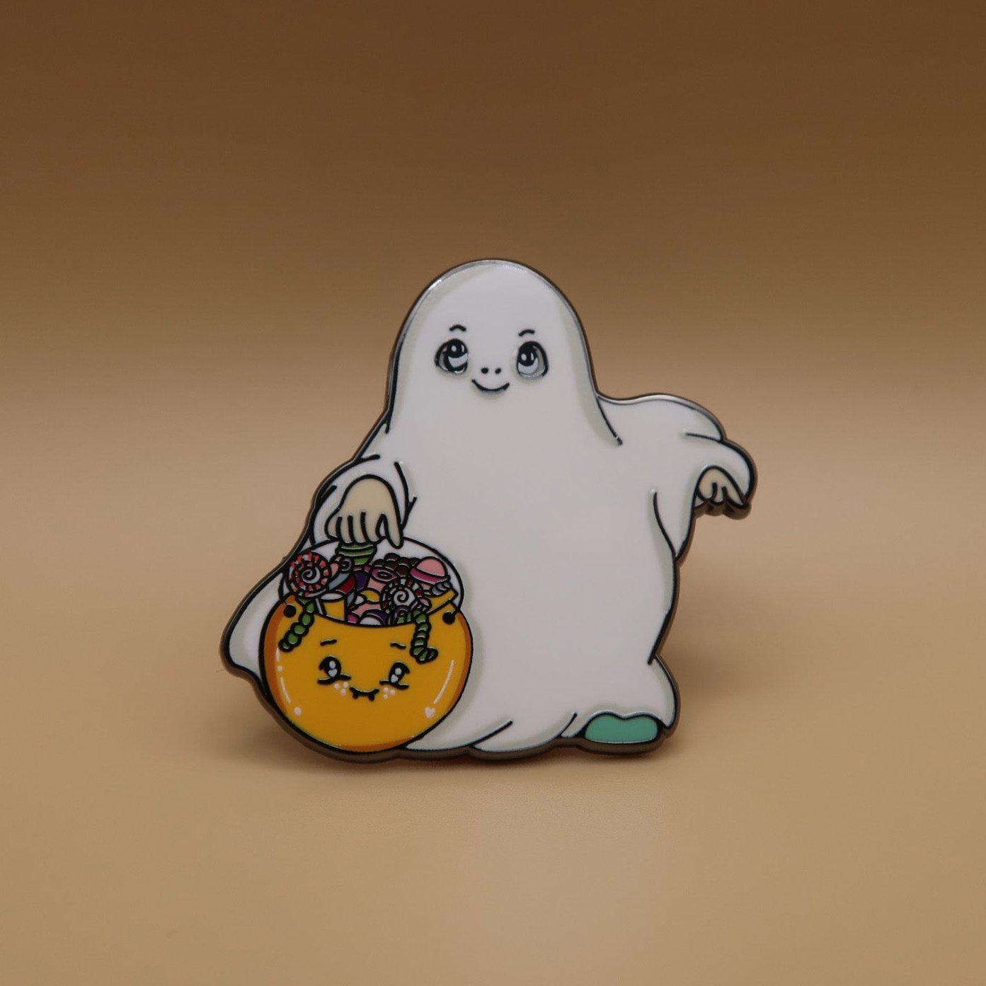 This charming ghost child enamel pin is ready to set off trick or treating.