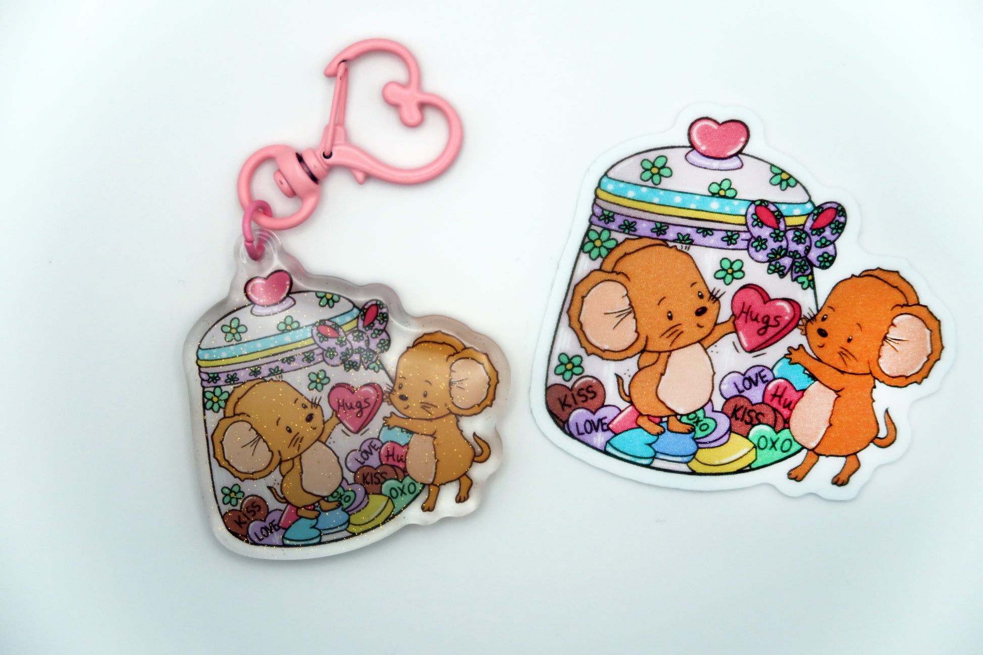 This sweet lill Jar of Hugs Mice Key chain is sized at approximately 2.5 inches with a smooth epoxy acrylic front and double sided print.