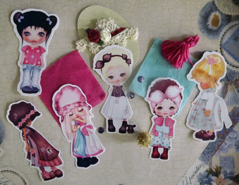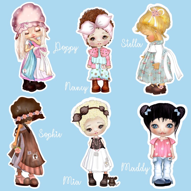 A sweet 2nd collection of Lill Dolls die cut stickers. Featuring Lill Dolls; Poppy, Sophie, Nancy, Mia, Maddy and Stella. Each little doll is sized at between 3 - 3.5 inches. This die cut sticker pack comes with a pretty backing card and is packaged in a cute protective sleeve. Each lill doll has her own unique style and character. The stickers are printed onto gloss vinyl sticker paper of premium quality.