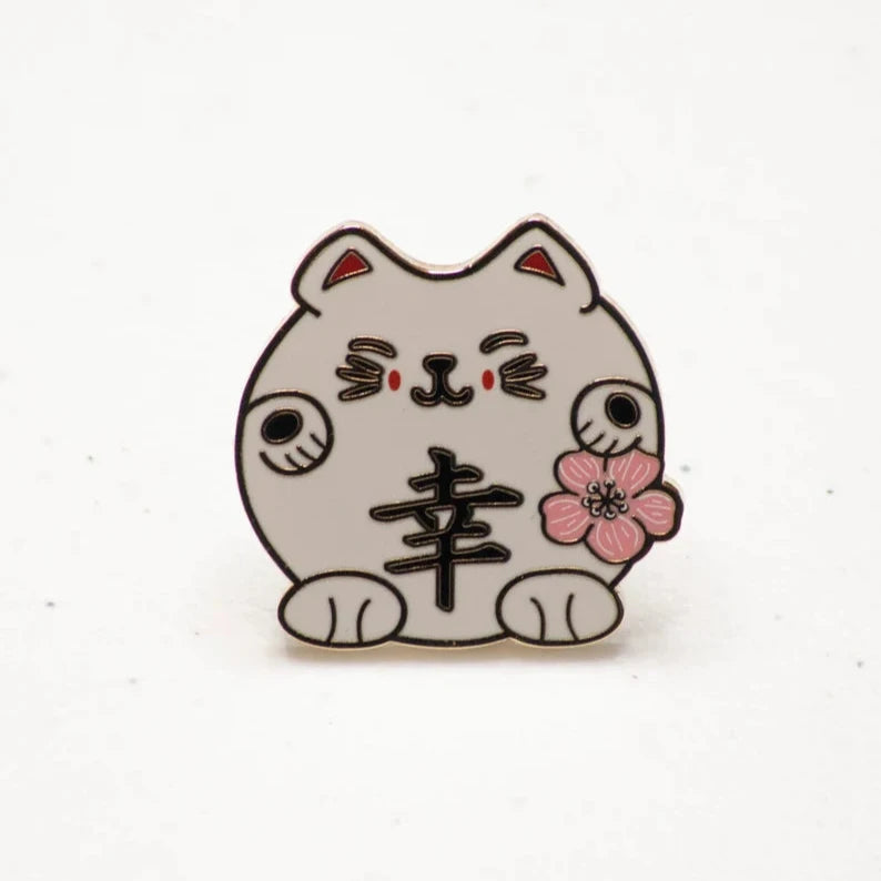 With the Japanese symbol for happiness on the tummy - this super cute kitty is a must have for your growing pin collection.