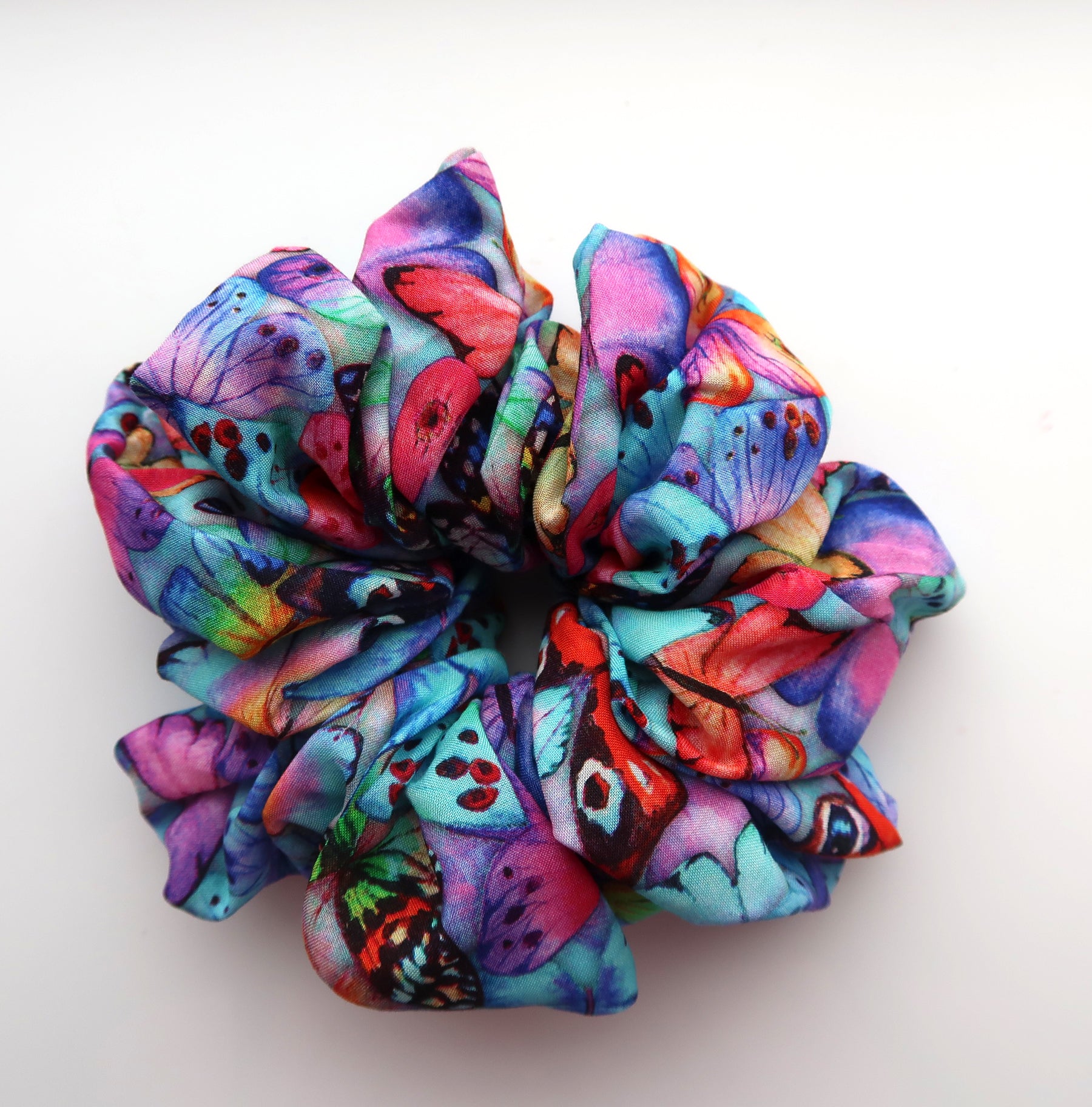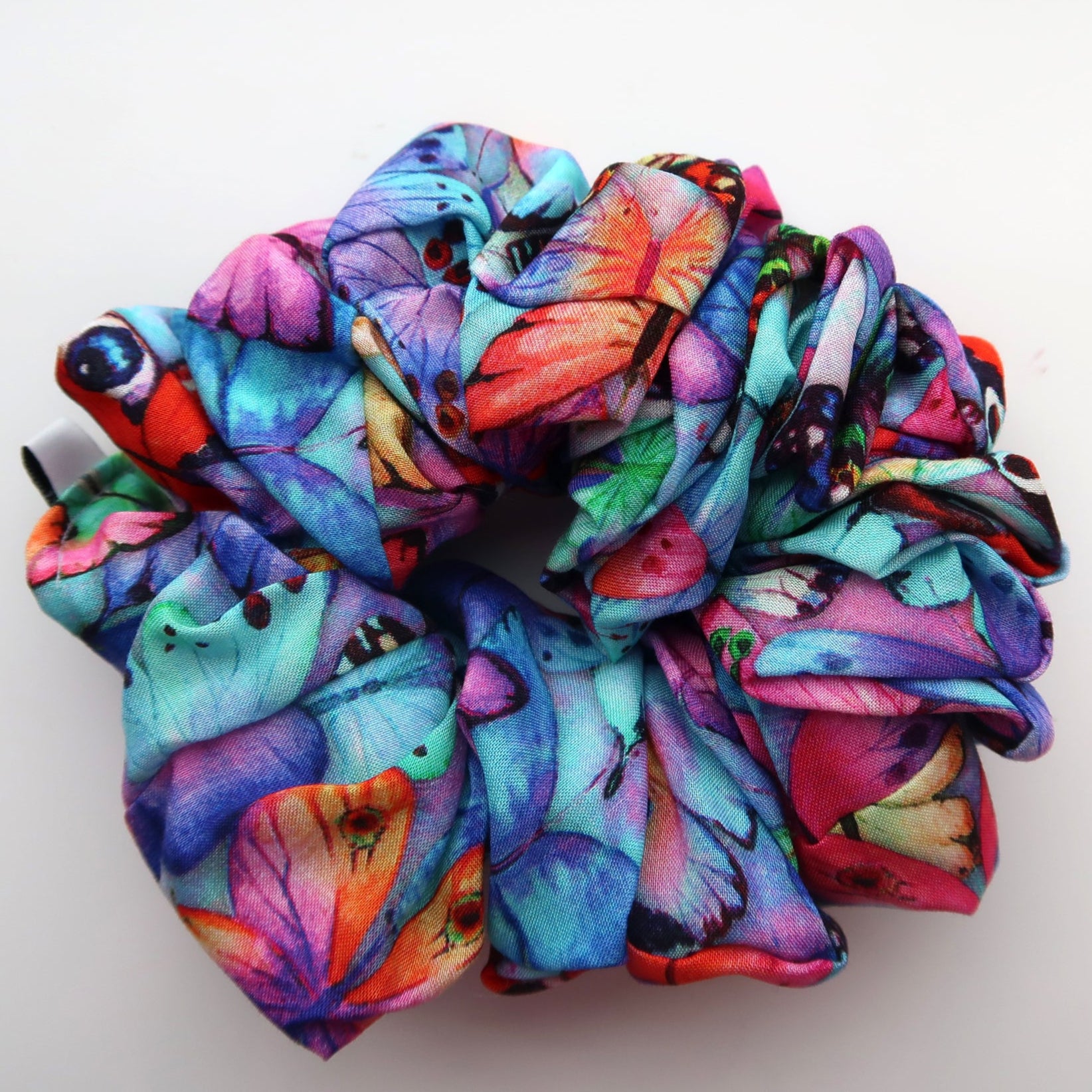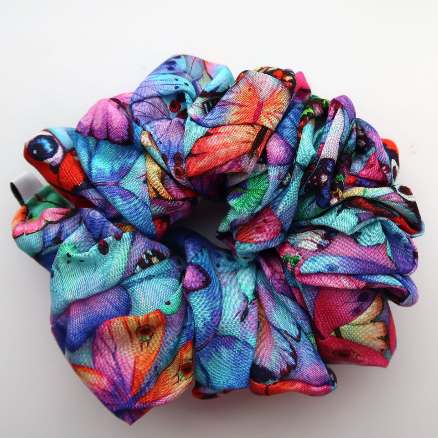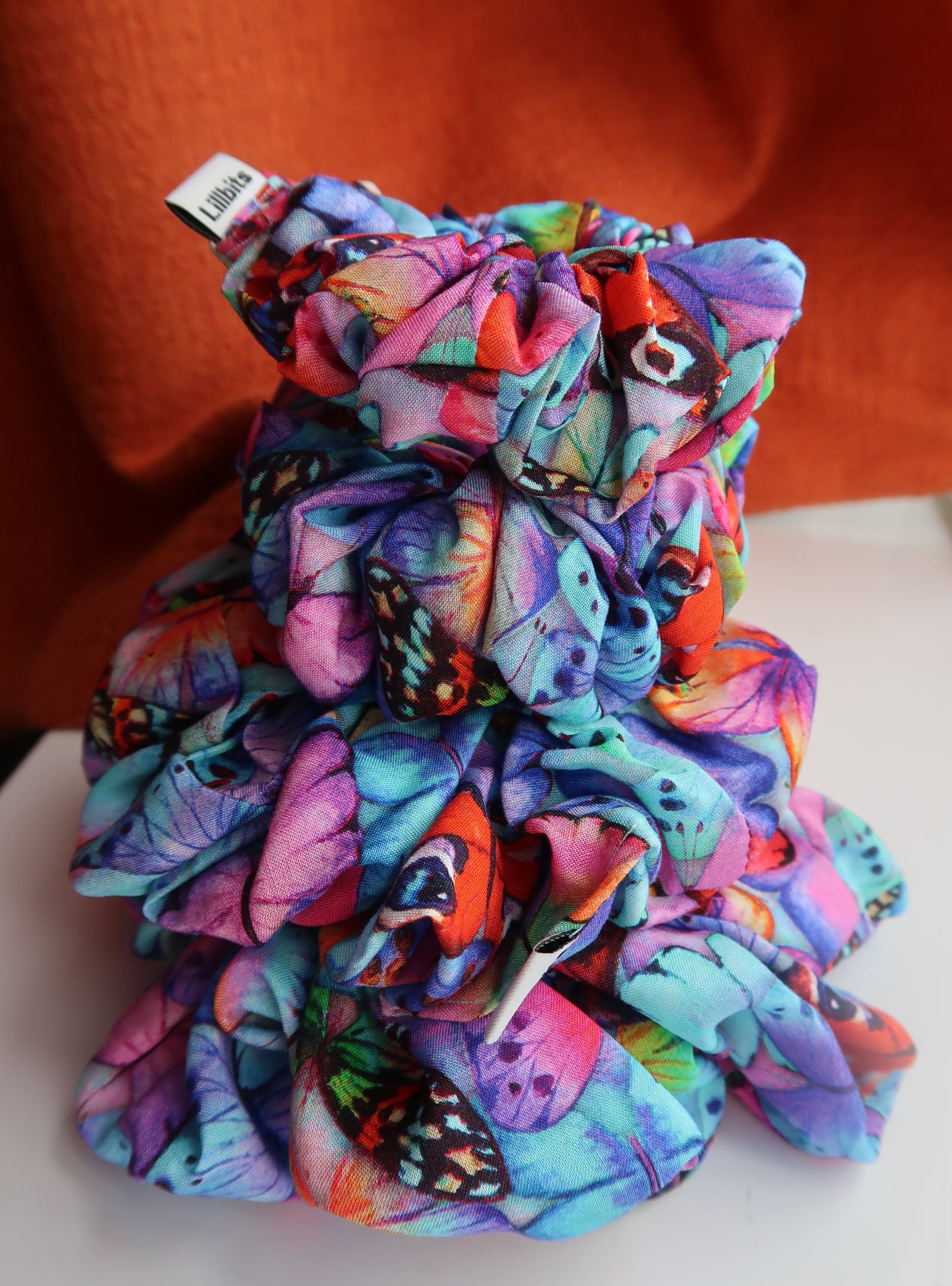 A brand new fabric print Rainbow flutters scrunchies now available in limited quantities across 4 sizes.