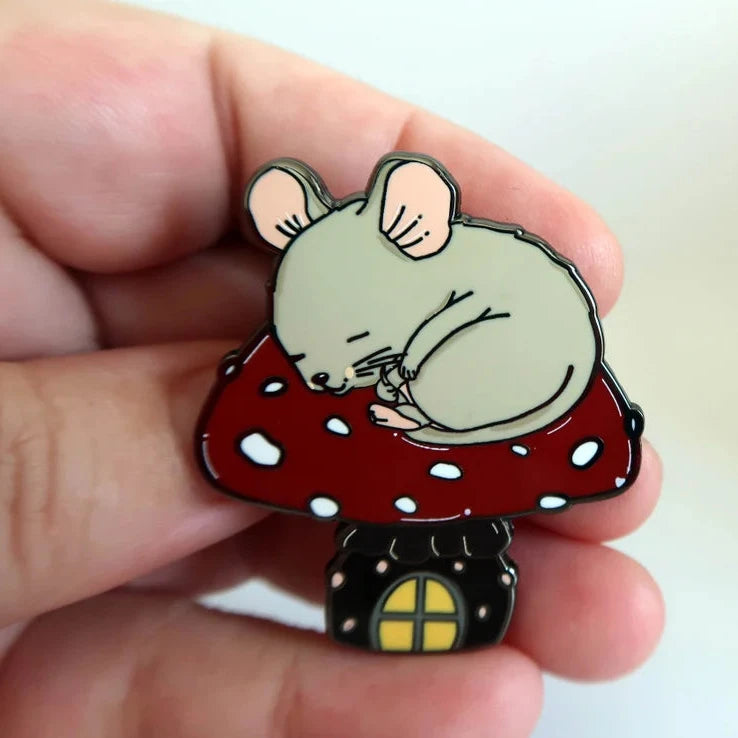 A super cute Snuggle Mouse hard enamel pin to add to your pin collection.