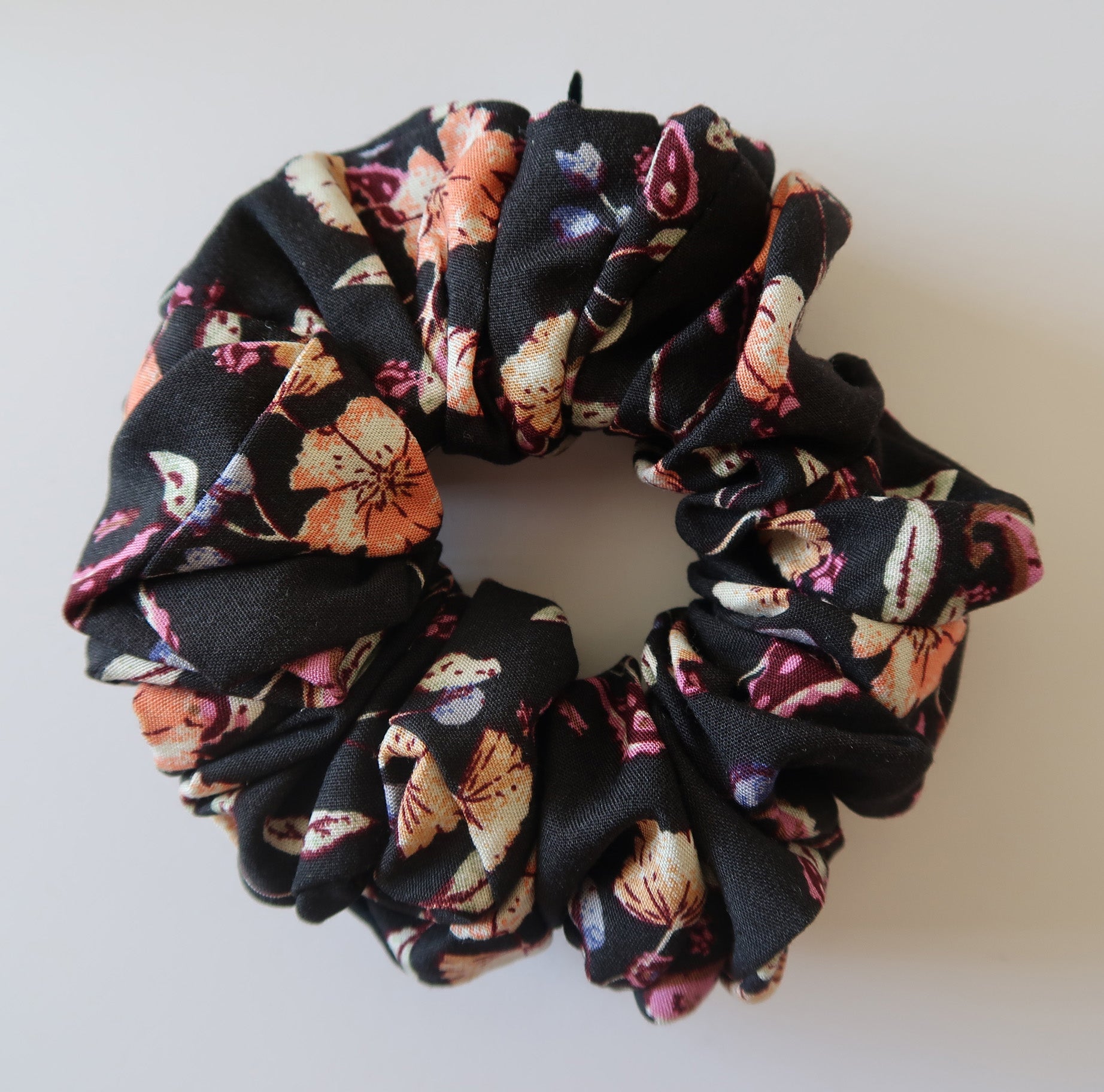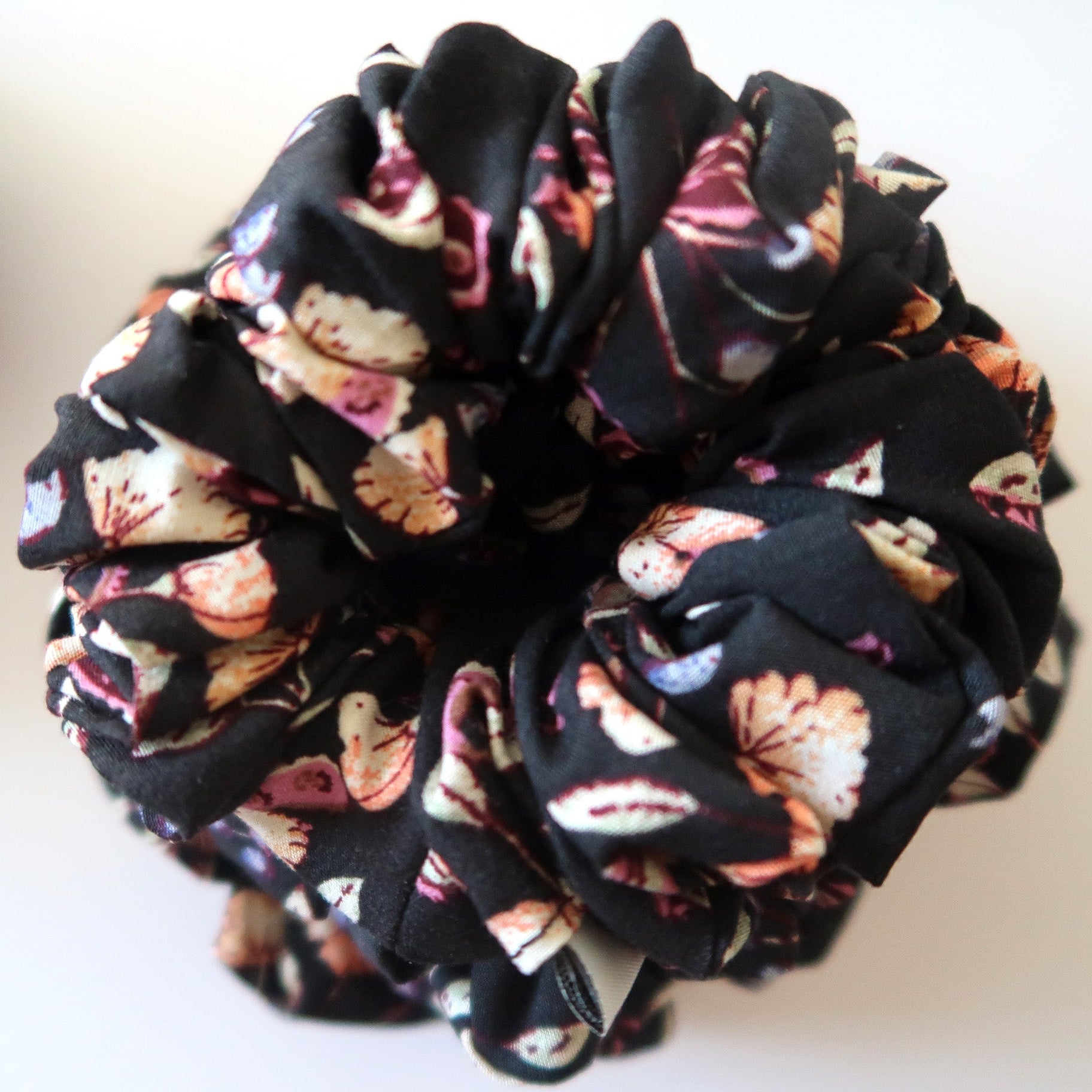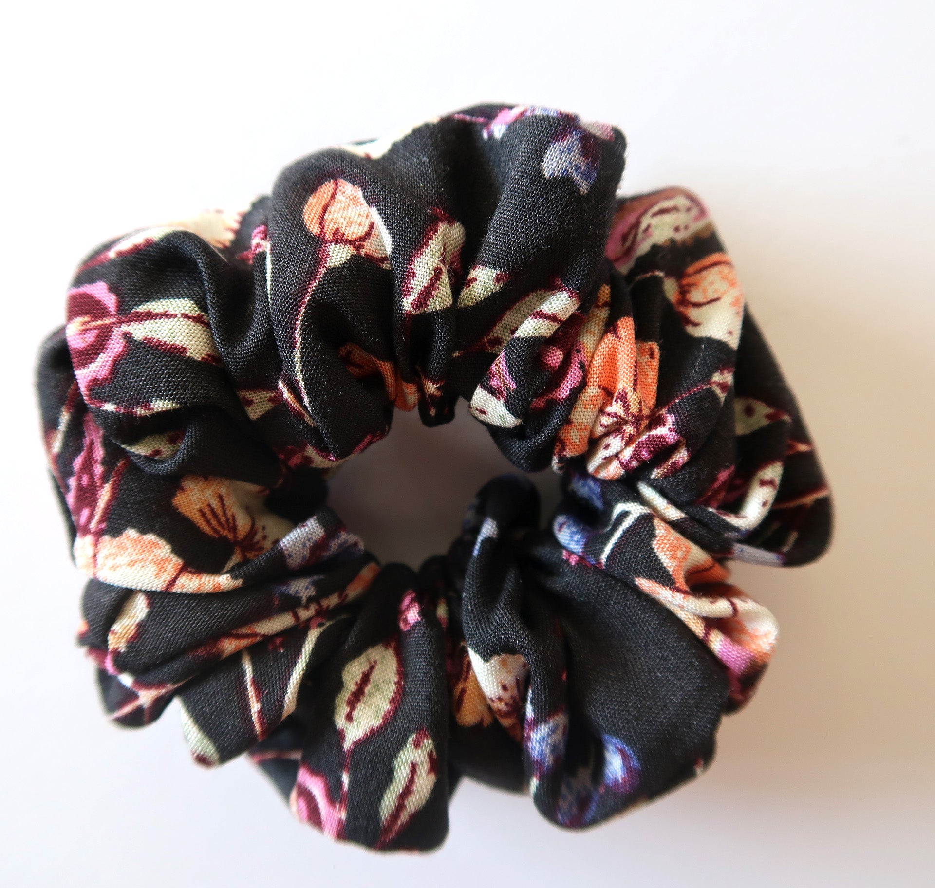 Delia is a pretty dark print with floral mix Viscose fabric scrunchie available in 4 scrunchie size options: