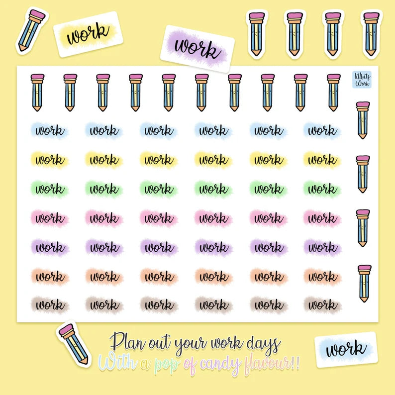 A fun colouring candy themed set of 'work' kiss cut stickers spread across an A6 sized sticker sheet.